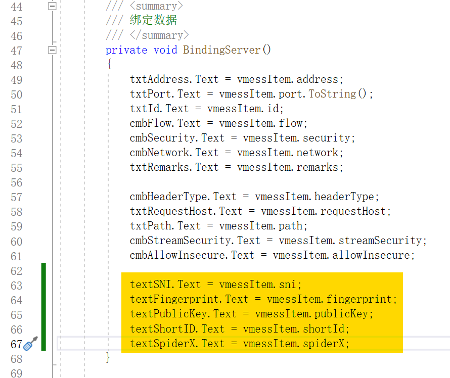 先查初始化函数, 在 AddVLESSServerForm_Load 函数里面有一个 BindingServer, 逻辑很简单, 就是把数据"绑定"到界面元素上去, 给界面元素赋值.
